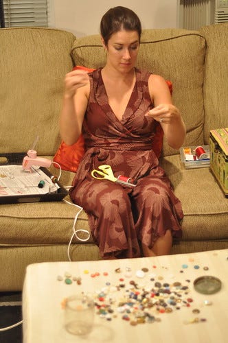 Knitting on one side, at least one patchwork project on the other. Ideas notebook buried under a pile of fabric scraps. You get the idea.
