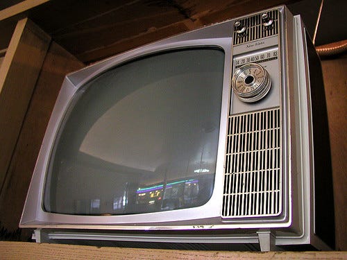 Picture a french lesson for a class of thirteen year olds in the early nineties. The teacher wheels in a television on a trolley. The TV is roughly a cube and weighs more than the teacher.