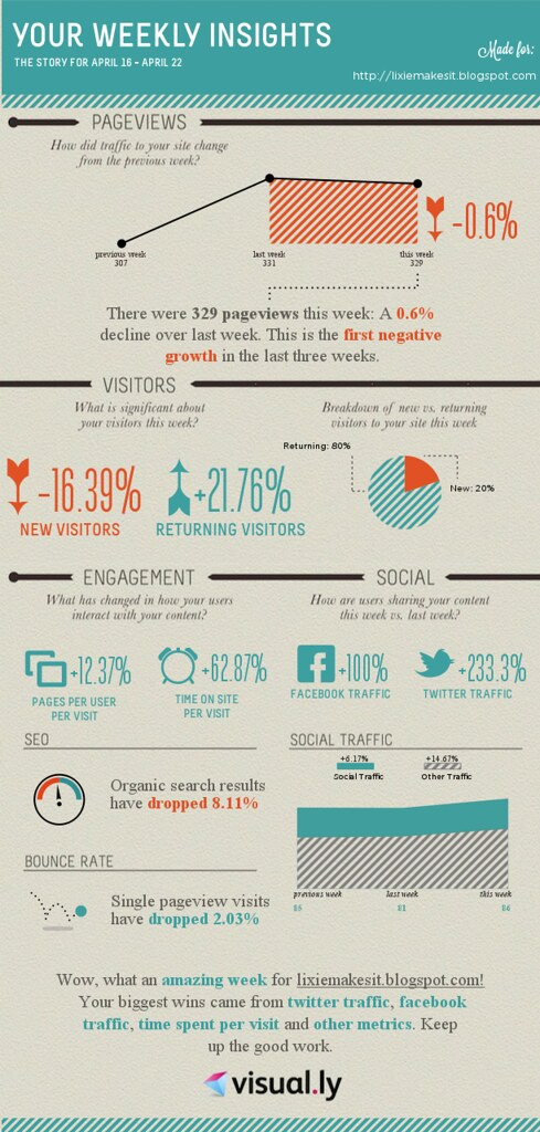 The challenge for Day 3 is to create an infographic. This is actually something that interests me and, if you are also a geek, there have been an interesting series of articles about them on Harvard Business Review Blog recently. However, life has been busy and so I cheated and went with a Visual.ly template based on the google analytics for this blog. That's not to say it's not pretty cool.