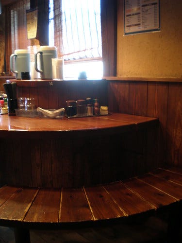 Pooch and I went for traditional Ramen at a place opposite the station afterwards. Wonderful old dark brown wooden benches and tables.