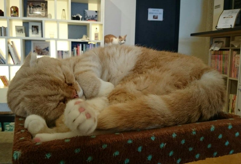 Well, yes, it seems so. When I was a child I would have nuzzled the family cat's paw with my nose were it so presented. Were I to do this to Bruiser I have no doubt that I would lose not only my nose but a good chunk of cheek and possibly an eye. While I was there he urinated on a snuggling blanket and half-nelsoned a smaller cat to the ground. It's a small improvement on his deciding to mate with one of the munchkin cats right in front of me. But on this occasion he was under pressure. Three valley girls had come in and were trying to take selfies with the cats. As one cat circled as it got ready to sit down the girl shuffled in a circle around it, keeping her pout in place, waiting for the perfect angle. This was particularly funny with Bruiser as he makes a point of looking away when anyone points a phone at him. The secret...