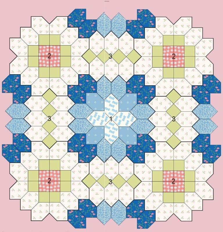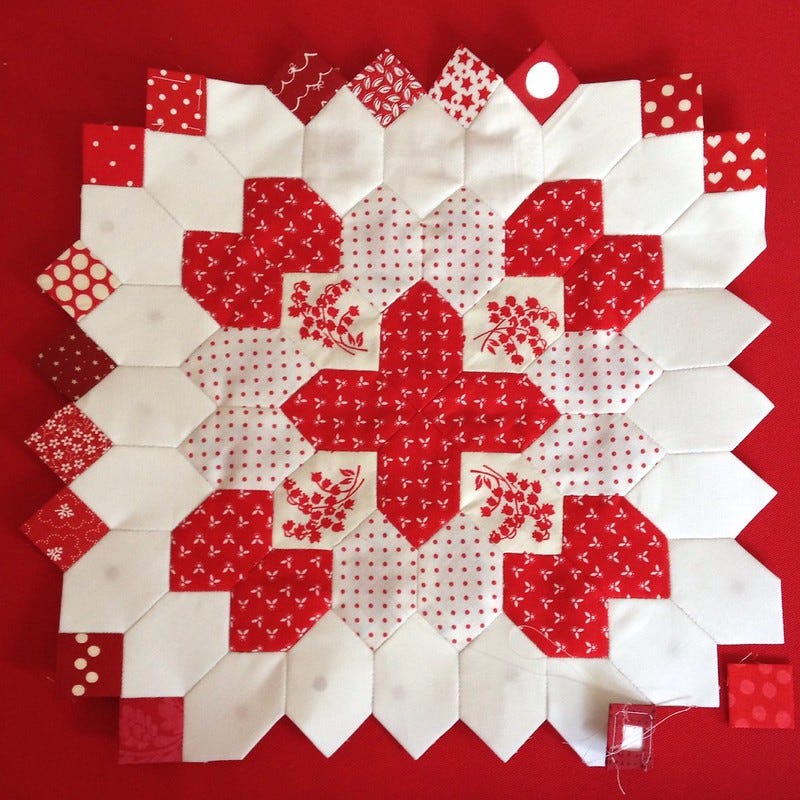 For every block I therefore need 24 white honeycombs and 16 red squares, and for my 4-squares marked '2' in the diagram, I am going to use a 2" square of white. So for 40 blocks, I need 960 white honeycombs and 640 red squares. And that's not counting any kind of border. Wow. Here is one I've added the extra white pieces to and am adding the red squares in.