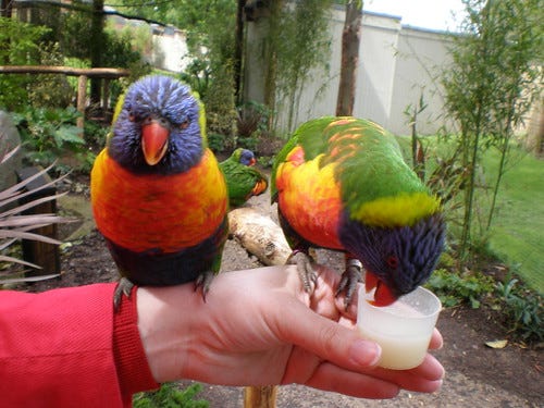 2. Feeding the Rainbow Lorikeets. I had one on each shoulder, two on each wrist and then one landed on my head.