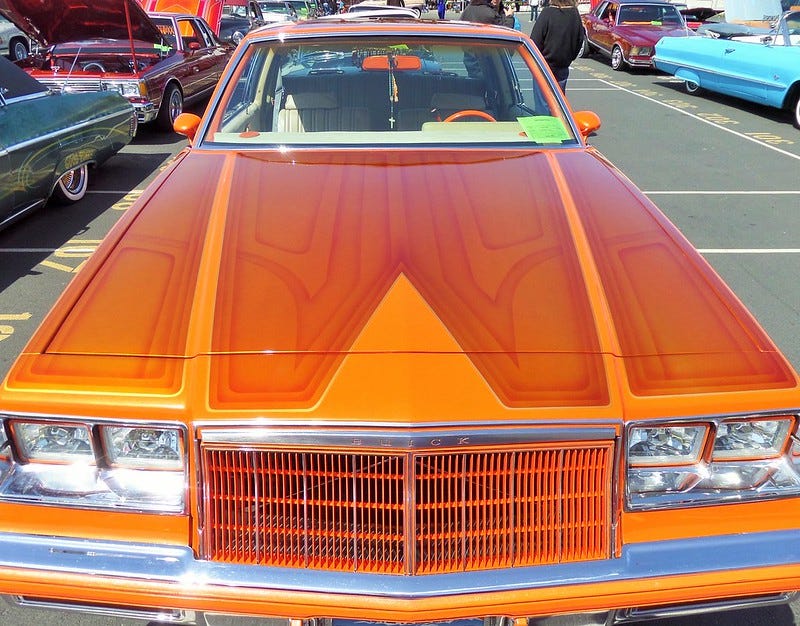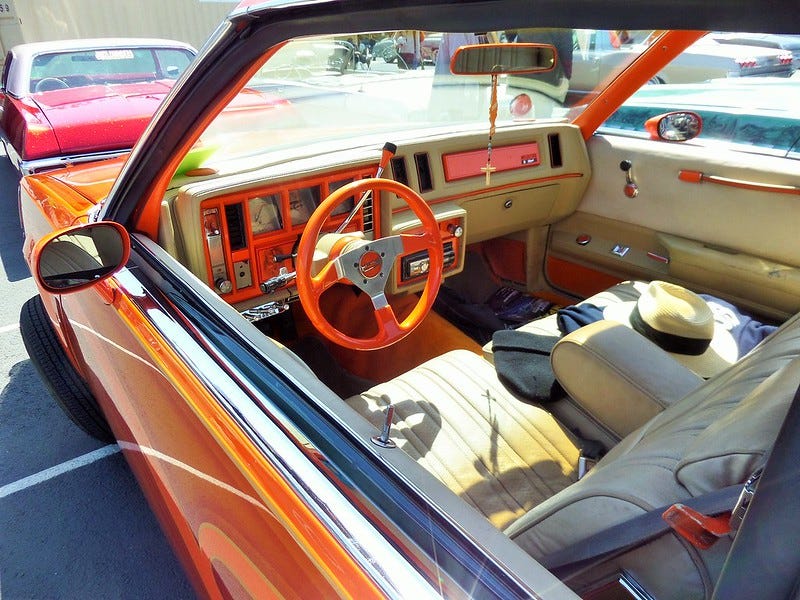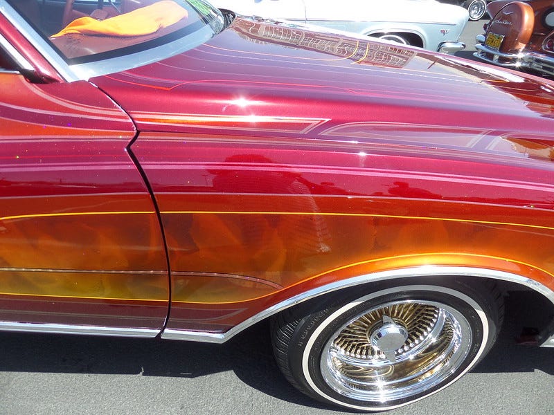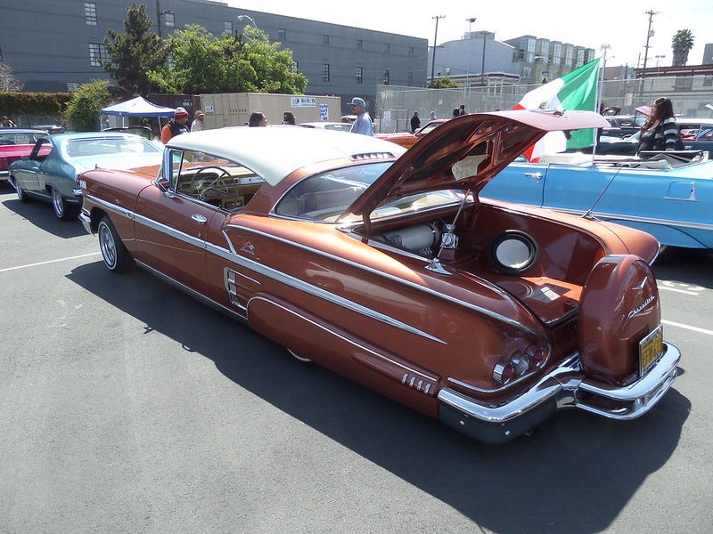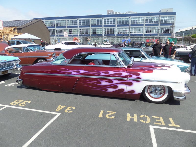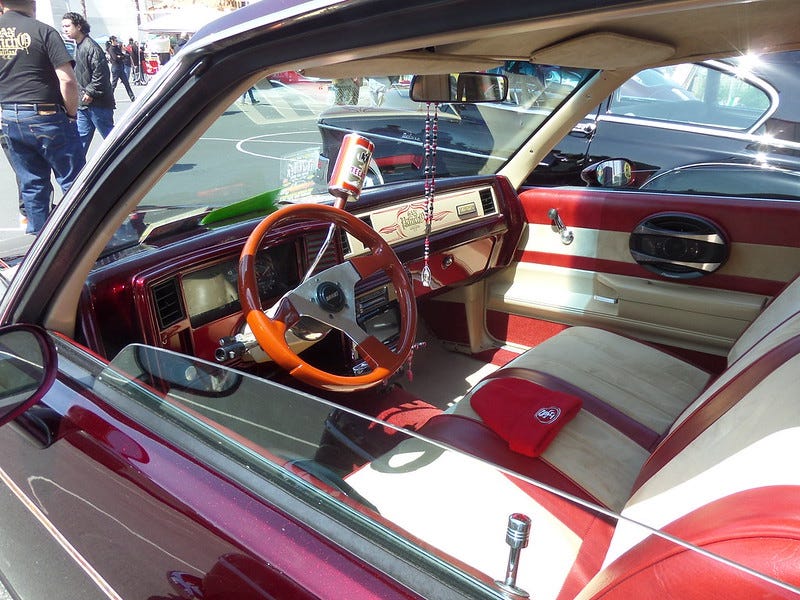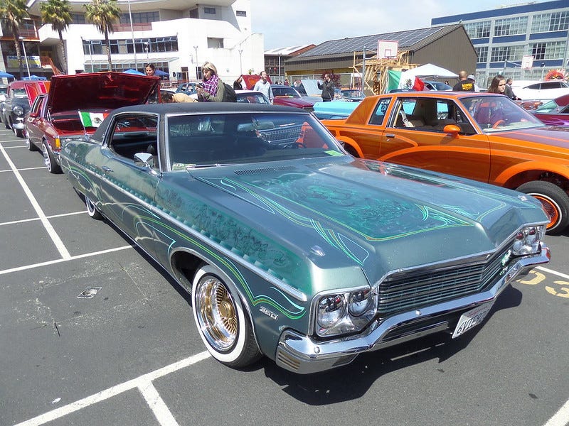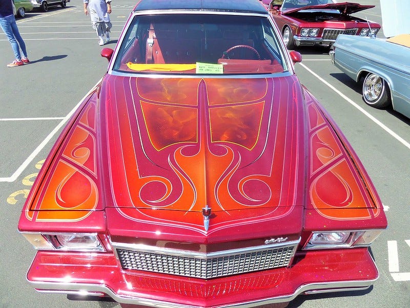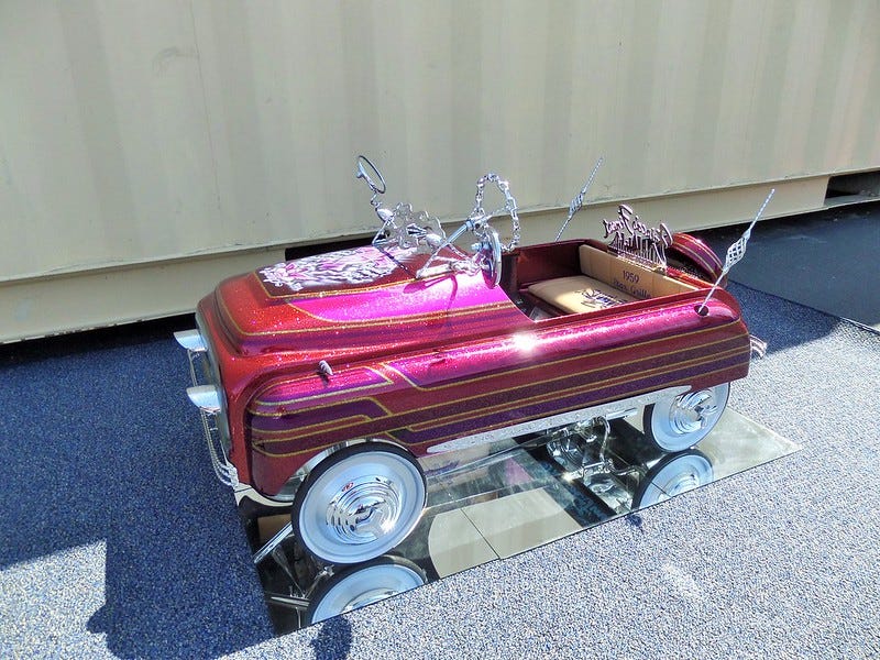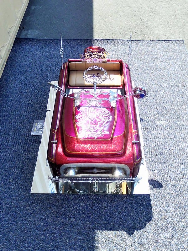 I had read about this in SF's FunCheap Newsletter and, with find memories of Eddie Guerrero nestling in my brain, I made my way there on Sunday with a hesitant Pooch in tow. "You don't even like cars." he tried telling me as we walked there. That is true, in that I wouldn't sit down and read an article about the latest Volvo, but I do like craft - and customisations like these can only be done by true craftsmen. And craftswomen.