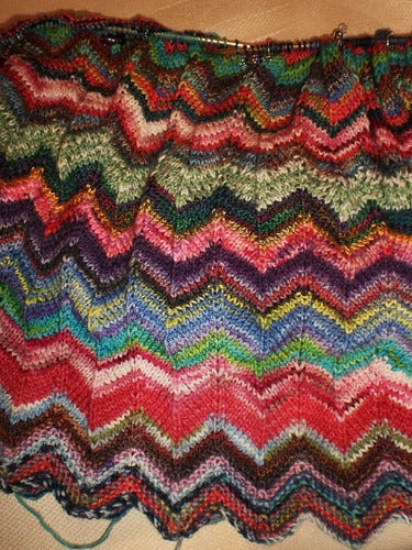 I'm halfway up the first sleeve now. I'm going to make the sleeves more or less match although it'll be impossible to do it exactly because of the self-pattering sections. But still, I think it'll look quite fun. It reminds me of another pin I've seen recently: