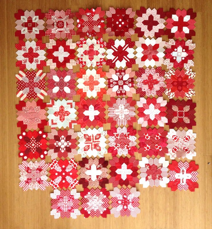 The time has come to start the inbetween pieces that join them together. I've decided on kona white cotton just to keep it simple and I'll be using extra pieces of the red and whites I've and others have used as the squares between them.