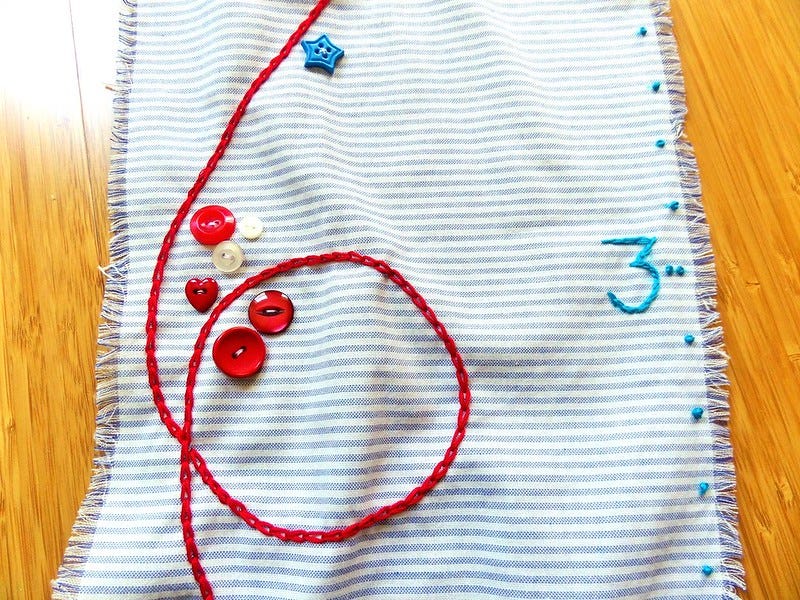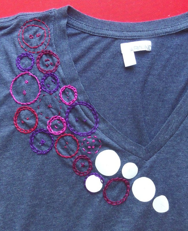 My white fabric marker had run out so I used circles of freezer paper as templates. I ironed them in place and then embroidered around them. They just peel off afterwards.