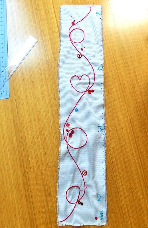 I do adore chain stitch. It's very satisfying to do and the finished design stands out from the fabric beautifully. I used it for the red in the height chart and again on this t-shirt-in-progress.