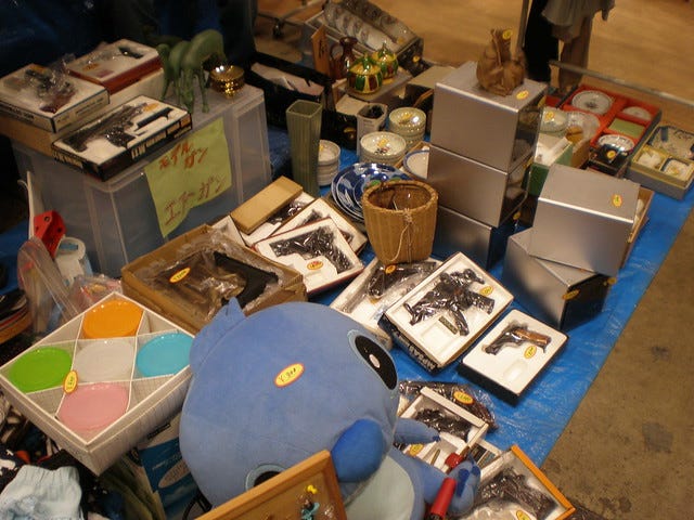 There were three halls. You do the maths. Except don't - apparently there are 1500 stall holders and they got 6500+ visitors yesterday. Yowsers. Plus it's on over 3 or 4 days. That is a lot of stuff. The middle hall (shown above) was people without cars and handmade things. The halls either side, which were the same size, were more like a british indoor boot fair where people had rocked up with their junk in their car's trunk and were hawking it to anyone who went past. For instance, this person was selling replica guns and chinaware.