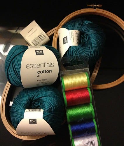 Isn't that yarn a lovely turquoise? I have a pregnant friend who loves that colour so will be crafting a cardi and perhaps a hat for the baby out of it. I also got a couple of wooden embroidery frames - one circle and one oval, to frame WIPs. The thread is viscose which means it is all shiny and therefore great for machine embroidery. Mmmmm, shiny...
