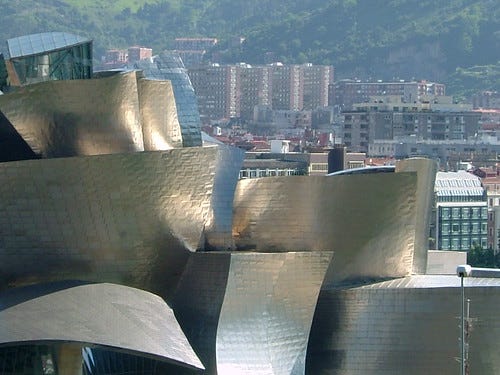 Not right by it of course. One is not a gabillionaire. But within 2 mins walk. The sunset yesterday was really lovely - eighties blues and yellows faded to blues and greys such as The Guggenheim is made of.