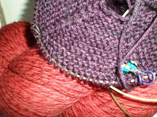 I'm now about a third of the way through the 3/4 Hap Shawl - so maybe I'm actually about 1/4 through the whole shawl? (Maths joke) (kind of). I dithered about the second yarn and have gone with this orangey red one I got from a seller I met on twitter.
