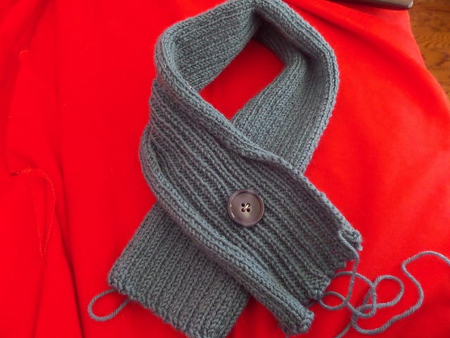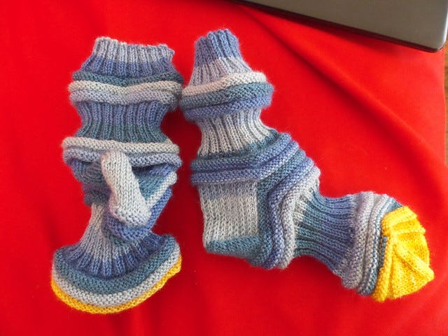 I have another pair in shades of white/beige (so also have yellow toes) on the needles. Then this one actually needs the button to be sewn on but is a small cowl.