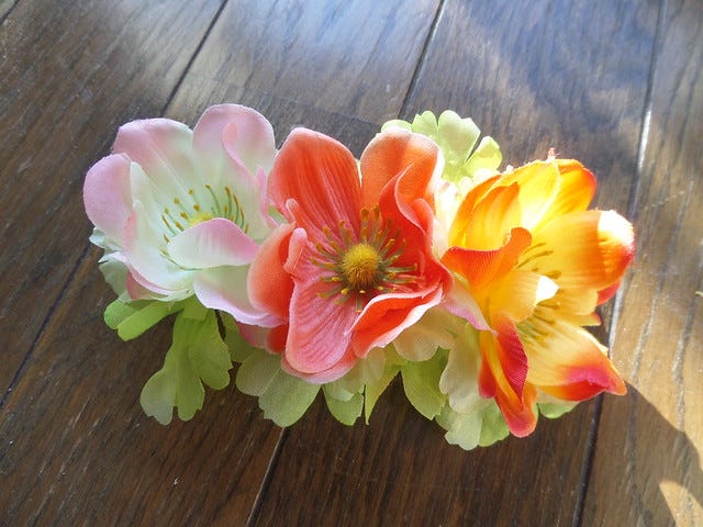 Finally, this is something where I bought the bundle of plastic flowers about six months ago because they were so bright and cheerful, and decided to add them to a hair barette about 3 months after that. It's taken our leaving for me to finally get the glue gun in gear.