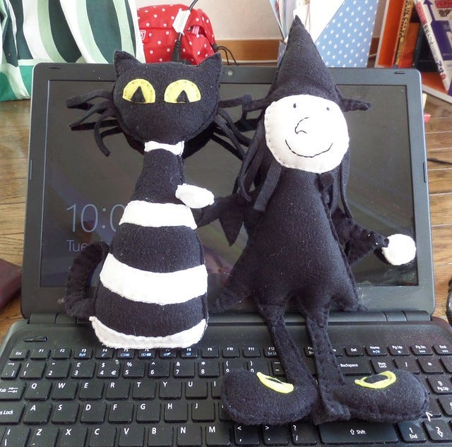 My final make for my niece is these Meg and Mog dolls. I was surprised not to be able to find a pattern for them already out there so maybe I'll share mine when I once again have a scanner. My one went on Sunday. The closest I found was a knitted Mog on Ravelry but I wanted to sew these.