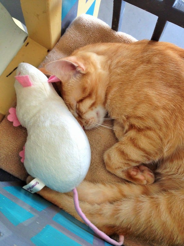 So adorable. Then a different ginger boy was curled up with his mouse. He had assumed more of a 'croissant' position.