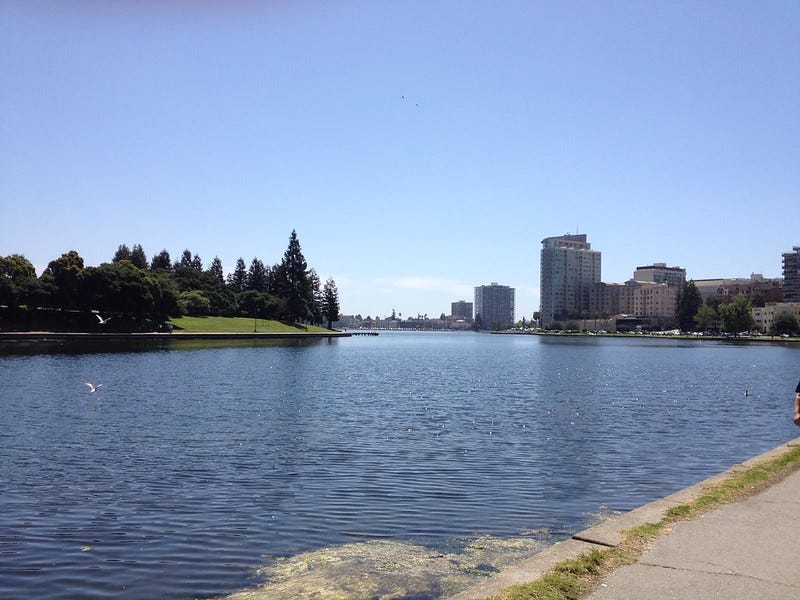 I was early for my cat appointment this week so I took a tootle around Oakland. Actually I was looking for a cash machine, but en route I found a huuuuuge lake.