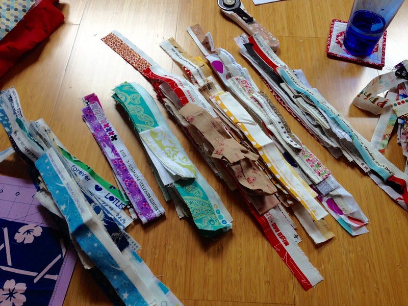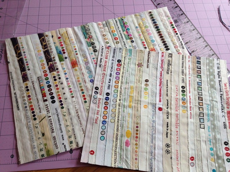 This left me without a cover for my sewing case when my eye fell on a strip of selvage. Out came my collection and I found myself sorting them into colour piles.