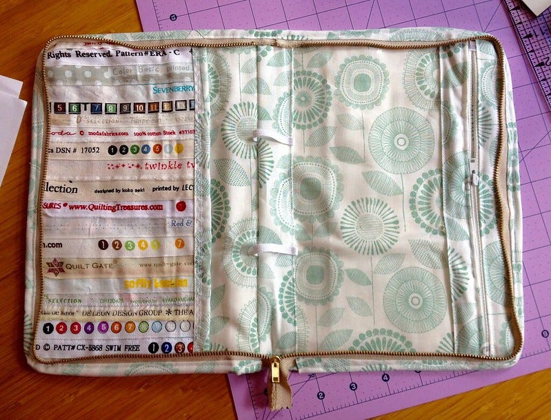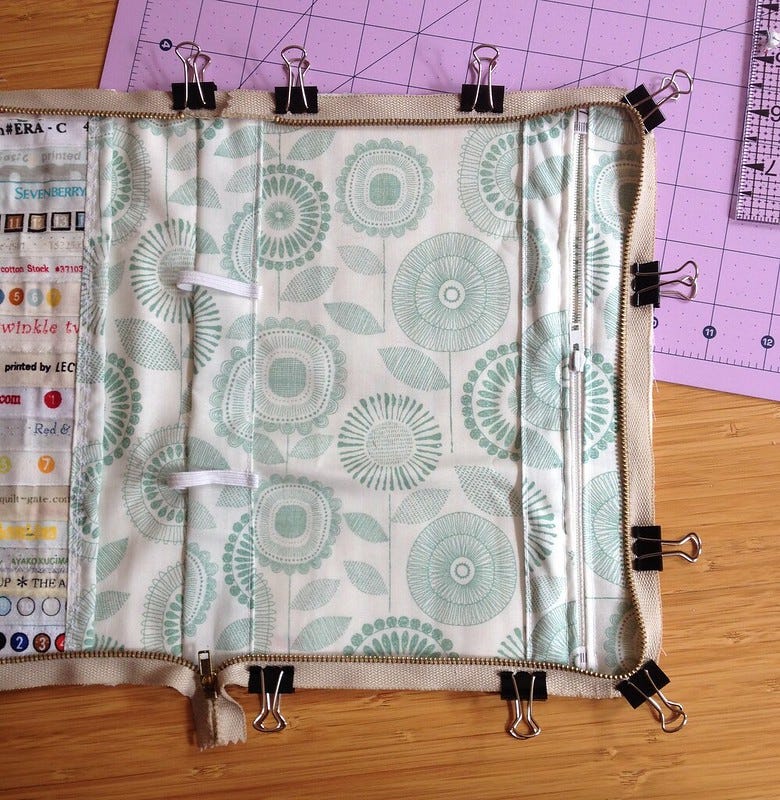 Here is the inside with the zip and bias binding in place. Vinyl pocket on the right and selvage pocket on the left. Two elastic loops to hold thread.