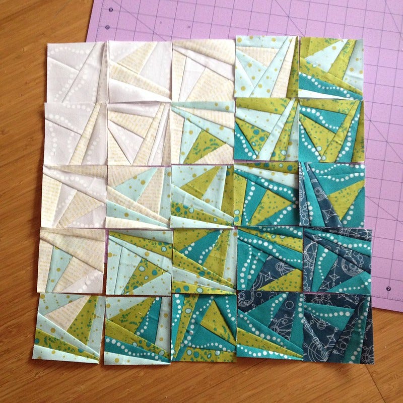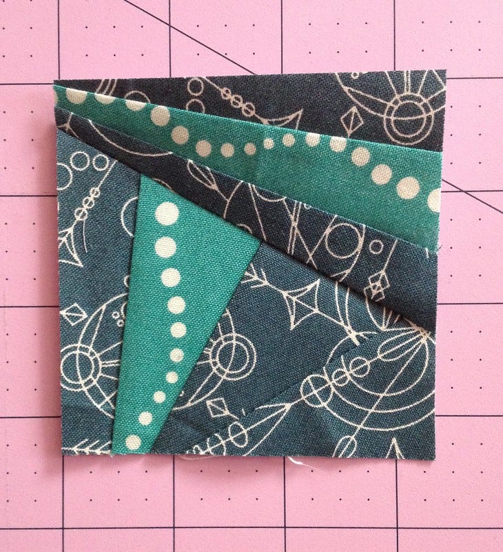 My other make-in-progress is based on a quilt in Paper Pieced Modern which I have on loan from the Library. I'd seen different versions of the quilt on a few blogs and decided to use the idea for a mini quilt. Here is my block.