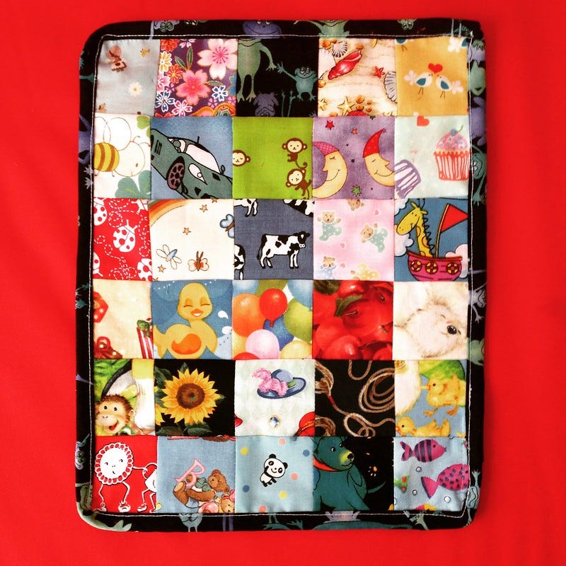 The Sewing Case took quite a while to make - lots of pieces of different sizes and materials - while this one was much quicker. It came out about 12"x14" and is a tiny version of the i-spy quilt I made for my niece.