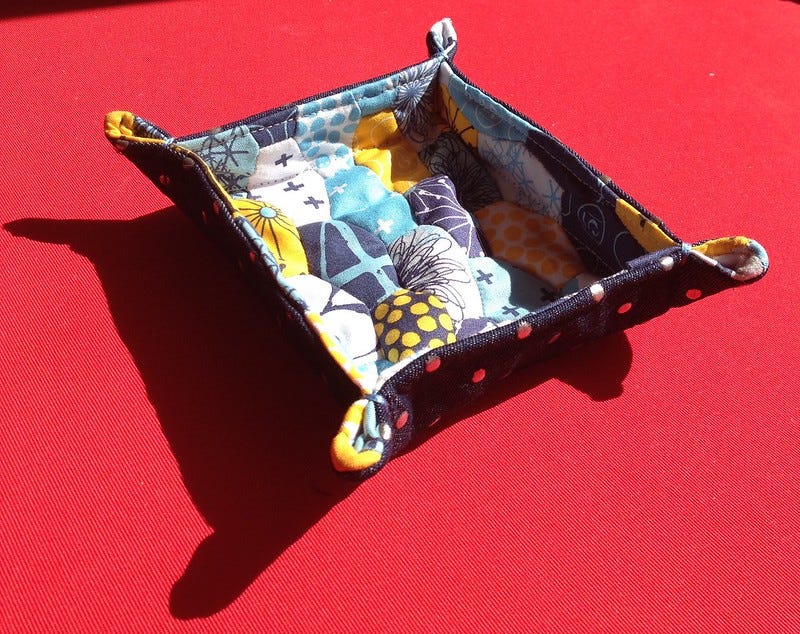 But I decided I loathed the look of the shape. Maybe they might work horizontally, but like this they simply look squashed. I had a look through Pinterest for some inspiration and decided on a fabric tray, using some denim with raised silver dots that I found a scrap of when I was still in Tokyo.
