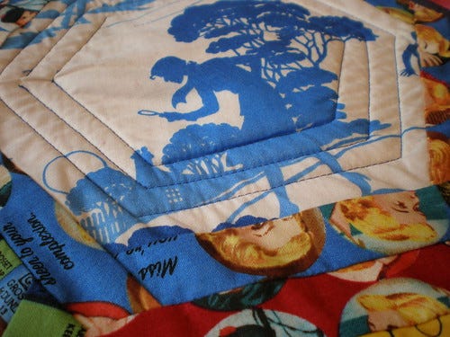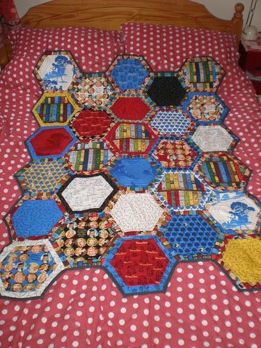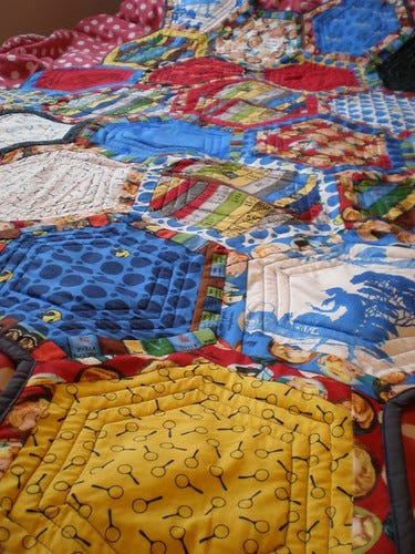 Admittedly a slightly odd size - dictated by the layer cake I bought plus a couple of half yards of one of the book spine prints and the red faces one. I've only got scraps of the cake left and about half a fat quarter of the other two.