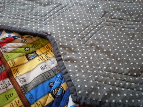 The backing is some delicious grey polka dot flannel which, with an old blanket sandwiched in between, makes the most huggable quilt you can imagine.