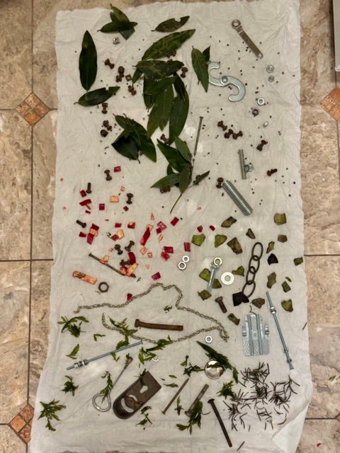 This first one was more by way of a “control” rather than an experiment since I was already familiar with the various elements and the colors they gave. What I was really interested in was stage 2. On the left we have the exact same plants but interspersed between them are bits of iron. Chains, nuts, bolts, springs, screws and so on.