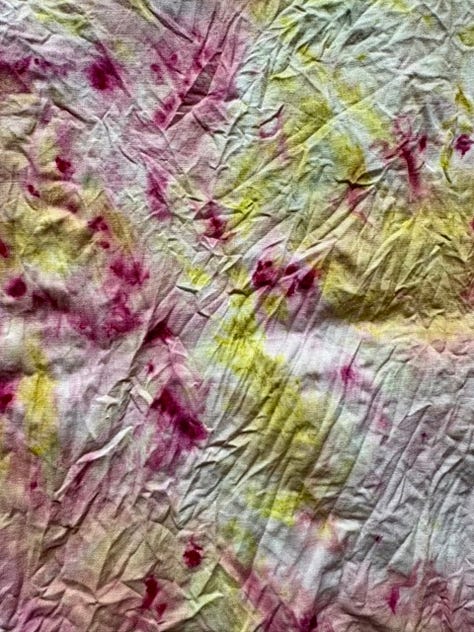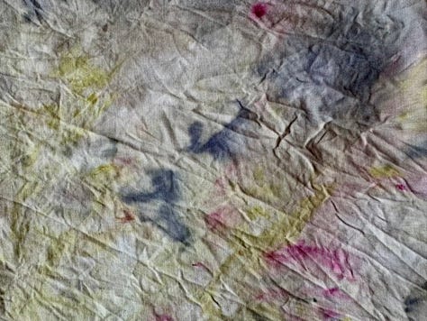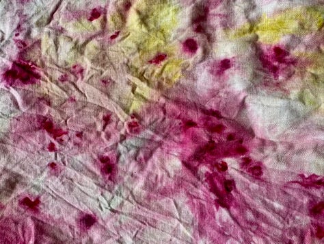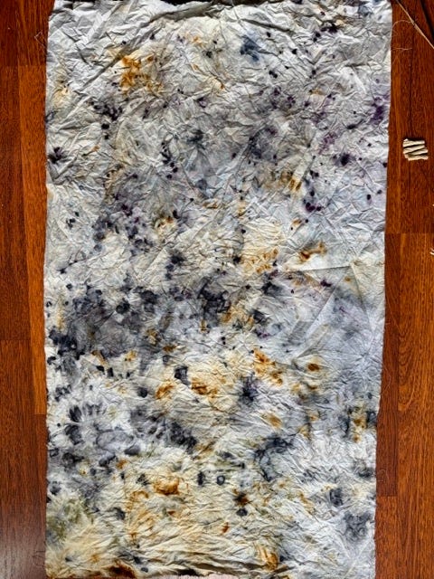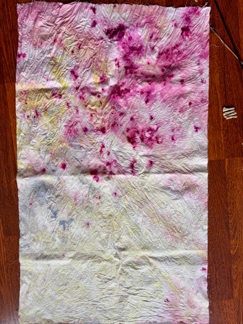 I took zero pics of the process but essentially I wet the fabric, rolled it up, and steamed it for 15 mins before allowing it to cool, unrolling and rinsing. (Of course you don’t use your usual pots and pans for this as natural things can be poisonous aka deadly nightshade, arsenic, all other members of the bay leaf family etc).
