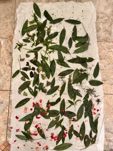 Top right speckles are the cochineal bugs. Amazing things (“mexican red” - more about them here. Saw them living their little lives on cactus in Peru.) Top left green bits are the carrot tops. Little bit of pink in the midsection from the avocado (yes, it gives pink dye), and then the blue further down is either an unexpected effect from the rosemary or a little bit or iron impacting the cochineal. General greeny yellow is the bay leaves.