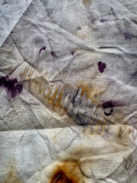 It’s the same cochineal causing the rich fuschia pink and the almost black purple. It’s just that the iron causes it to go so much darker. You can see the outlines of some of the iron pieces too (which is why I prefer using actual pieces to using ferrous sulphate generally). The brown is the rust from the iron. For this bundle I prepared it in the same way as the first one, but also dampened the fabric with white vinegar. After steaming for 15 mins I let it cool down enough to handle then put the whole lot still damp in a ziplock bag with an extra shot of vinegar for 2 days, during which time it got a lot darker and without which I wouldn’t have the rust areas. Rust needs time to develop and the acidic vinegar helps hugely.