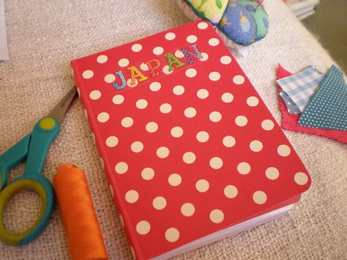 Another good thing and all this is that all those things I was saving for something special I now get to use before I have to get rid of them completely. Those polka dot letters on the front of my Japan notebook? Last time I used them was when Pooch and I got engaged. So I've had that part-pack of letter stickers for more than 6 years and have moved house with them 3 times all because I was saving them for some mystical occasion. Likewise this button: