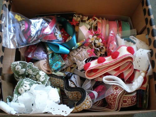 We're talking serious lists. Did you know that storage units the size of a small shed cost about £25 a week? That's £1300 for a year. I do not have £1300. I could manage more like £13. So that means a major destash which throws my buying habits into sharp relief. Take this box of ribbon.