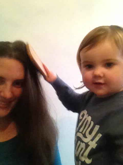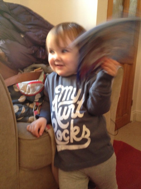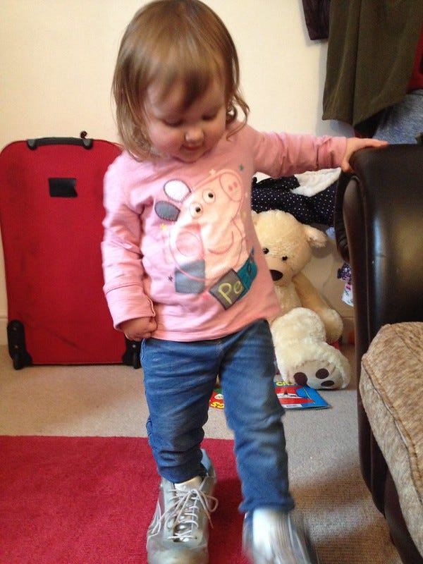 This was quickly followed by her 'helping' her Mum brush her hair, and hitting her on the head with the flat wooden side of my hairbrush. (Fnah fnah). There has been lots of shuffling around in my shoes.