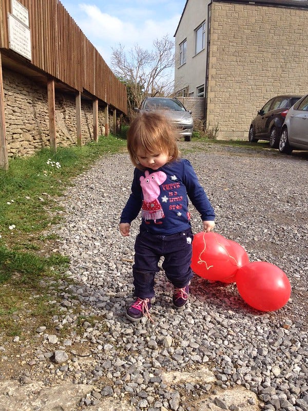 That is a reference to her beloved Peppa Pig who jumps in muddy puddles. It is also who is on her top. While we were out a lady gave us three red balloons!