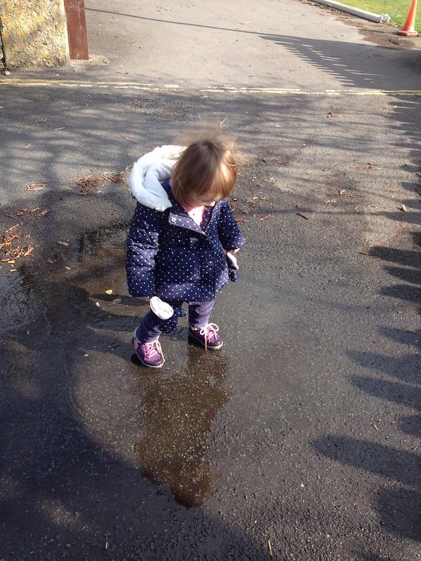 Then this morning she insisted we go out while Mummy was having a lie in, and we found a (non-muddy) puddle!