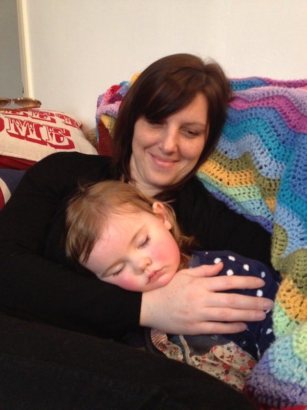 This isn't something she'd done before but she was even more excited when a pair of silver ballet flats arrived yesterday and has been 'wearing' those a lot. All that activity tired her out, so she snuggled up with Mum.