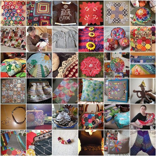 Actually it was more than this - about another ten - but the Mosaic Maker will only let me have 36 pictures. There's been a lot of sewing but also enough knitting to keep it respectable. There has even been crochet, although I haven't had a chance to take a photo of the blanket I've currently got draped artistically over my pyjamas. Let's not mention all the projects I've started that either got ditched or await my renewed interest!