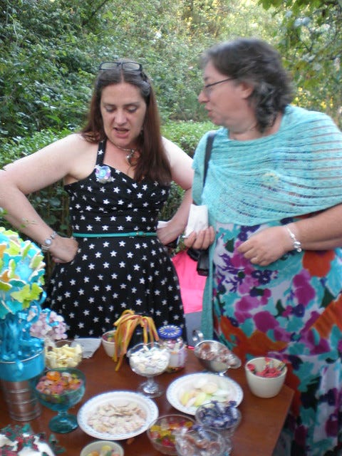 She looked like a Princess! My face was 99% grin through the whole ceremony which Laura performed brilliantly. As well as a mountain of savouries we also had a candy bar. It was brilliant! Lots and lots and I mean LOTS of sweets and little paper bags all hand stamped to put them in. Kids of all sizes were enjoying that one. And I adore this photo of Yvonne and Sue trying to make their selections.