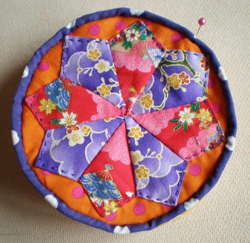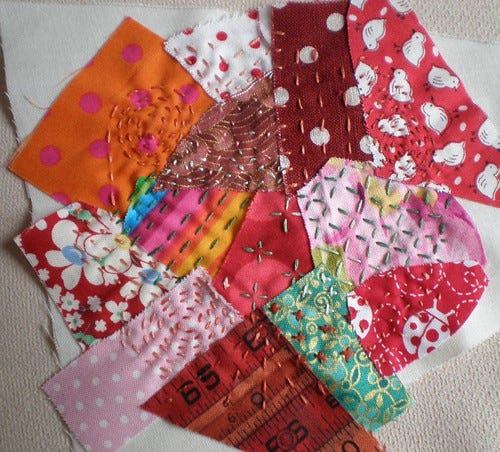 This is my second ever dresden and I'm pretty happy with it. I used scraps and paper templates. I did it with the pincushion blog hop in mind so I'll see how it turns out. Then there is some scrappy sashiko.