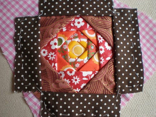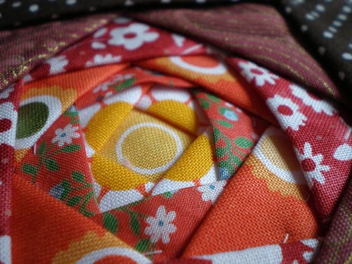 I am sure there is a technical name for this but I liked the effect and thinking about the difference fussy cutting could make. I got a little of that in the first round of 'petals' which were daisies on an orange background.