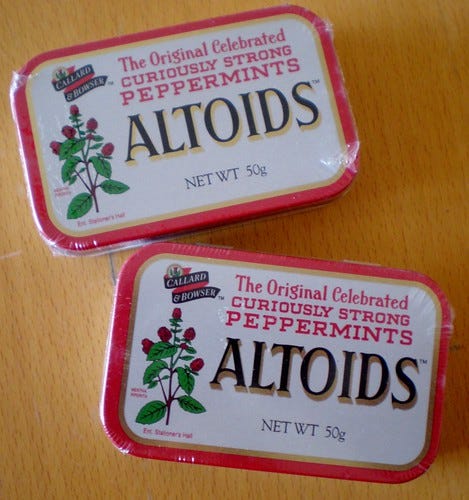 Lastly, my long search for Altoids or their equivalent ended with a bit of a fizzle. I went into 7 (count 'em) shops on Saturday looking for them (all the time coming down with what is possibly the future 'cause of death' on my autopsy certificate) without finding anything remotely similar. Remember - I needed two to finish my hexie wallet. Then at the height of my suffering Pooch does an Ocado order (he says he is too posh for tesco, despite their chocolate mousse being vastly superior) and finds them there. £1.25 a tin.