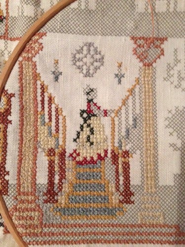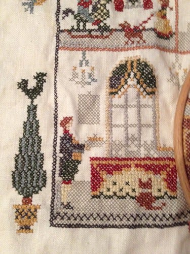 This doesn't really give you an idea of scale. The hoop is about 9" across. I spent hours working away on this. Sadly the chart has vanished in the 20 years or so since I picked it up so if anyone knows how to get hold of a copy please do seriously get in touch. It is labelled "WM Briggs and Co" and must have been from around 1988. I seem to remember buying it with birthday money when I was 11 but it could have been earlier. WM Briggs is part of Coats whose website is clear in saying they do not keep an archive so I am not sure where to start looking. I do still remember doing my favourite bits first. For instance the staircase.