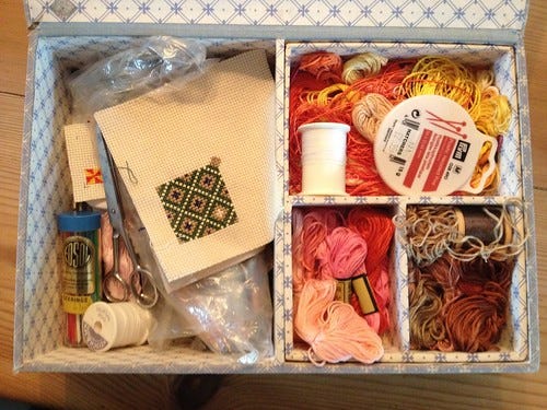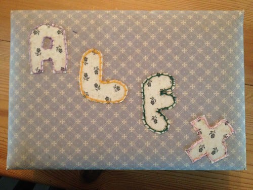 The applique was my first attempt at such a thing having been reading a seventies craft book in wide eyed amazement at what could be achieved with needle and thread. The fabric, I fondly remember, was from a pair of pants that had lost their elastic. Embroidery thread was something to be had from the market for something silly like 10p a skein and I used it endlessly for both embroidery and friendship bracelets and for darning pairs of tights and jeans and anything else that needed two bits holding together. At one point a friend of my Dad's declared her embroidery days were over and I almost passed out with joy as she handed me a carrier bag full of tangled skeins she had dumped out of an old drawer. Parts of many of them still reside in the box.
