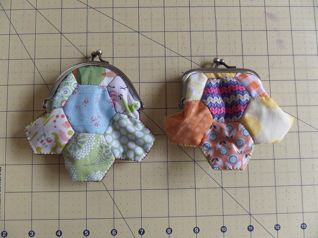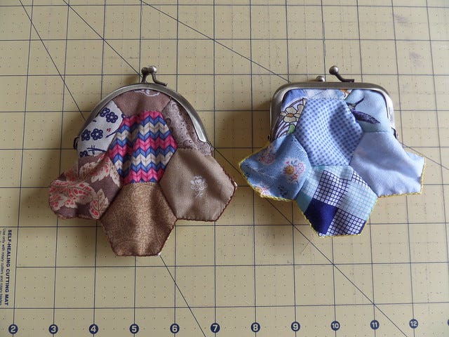 I am a big believer in pay it forward. Also 'do unto others' and other such sayings that turn a good deed into a kind of karmic ponzi scheme. Back in January I joined a 'Pay It Forward' meme on Facebook and have since been very aware that I owed two gifts. I thought deeply about this and decided to go with EPP metal frame purses. I carefully chose fabric. I hand stitched. I joined with blanket stitch using cotton embroidery thread. I lined. I inserted into frame. I threw away because it hadn't worked and they were ghastly.