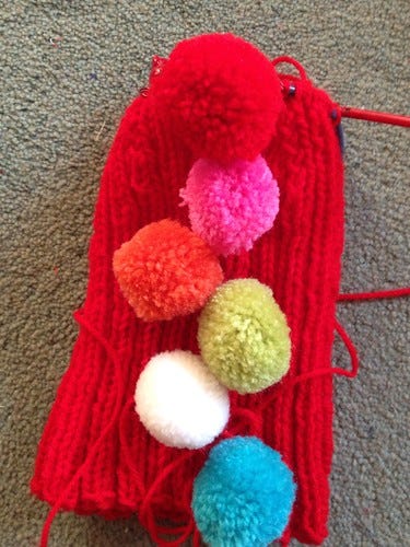This is a hat for my niece. The pom poms are part of the yarn (bought at SkipNorth) and were going to be random. Turns out that 80st k2p2 on US5 needles is the spacing between them! Meanwhile I spent ten hours on various trains yesterday going to Cornwall and back to plan an event. This gave me some time to try out my Hexie Travel case and make these.