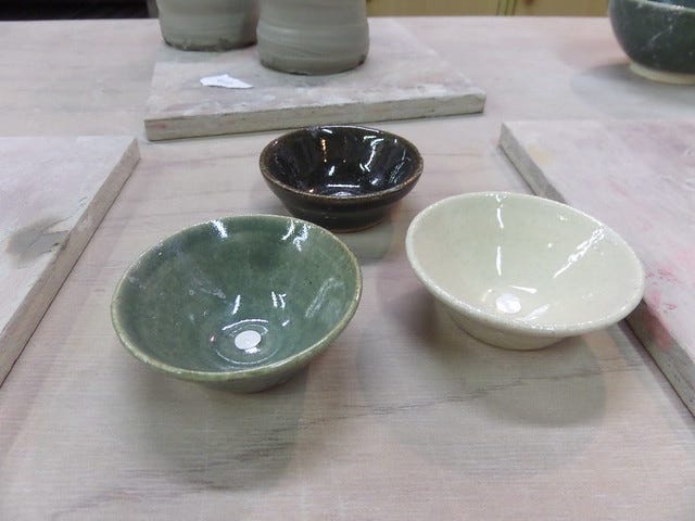 I decided to pay to get four of them trimmed, fired, glazed and fired again which cost me an extra 3000 Yen (about £17, calculated by the size of the objects) so it wasn't a cheap afternoon activity, but I did have a brilliant time. I could go back and do the trimming and glazing myself but not being particularly bothered I opted for the brown glaze and they do it all for me.