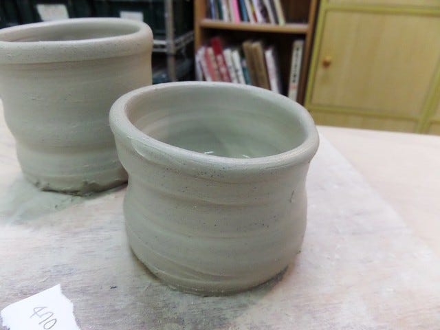 I was pretty embarrassed about it but the teacher was genuinely lovely and so patient! On my second one, which was also really bad, I got more of a feel for the clay and by my third I felt much more confident in my understanding of how it moved and how to touch it. The key is moving your hands very slowly and never, ever, suddenly disengaging. I found myself thinking about it as being like laying a new baby down - you don't just plop it down and let go. You support the head and then ease your hand out from underneath very carefully. This was like that.