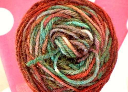 Of course it didn't quite work out that way. I left mine the second time for about half an hour and the yarn was dyed up to about 1cm in. So I skeined it and then chucked it back in the dye pot with a load of emerald and aquamarine. Then I forgot about it and let it boil way too high for too long and this is the result.